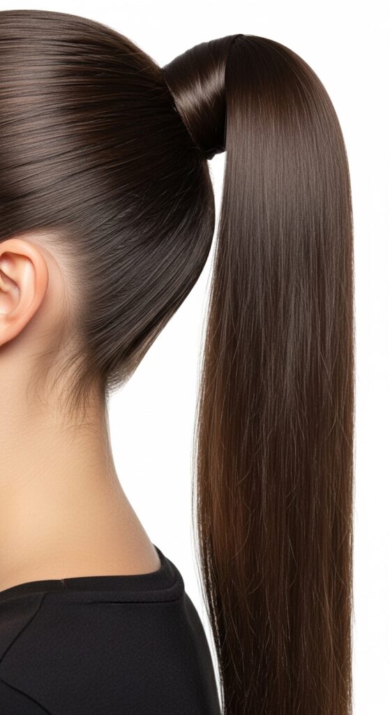 Use a gel or strong hold spray to smooth baby hairs and create a clean, sharp hairline. The higher the pony, the more dramatic the lift.