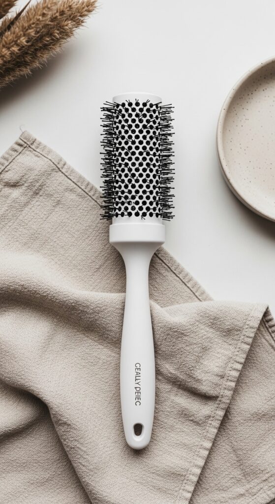 Not all brushes are equal. A medium-sized, vented round brush with a ceramic barrel is ideal for creating bounce and curve at the ends.