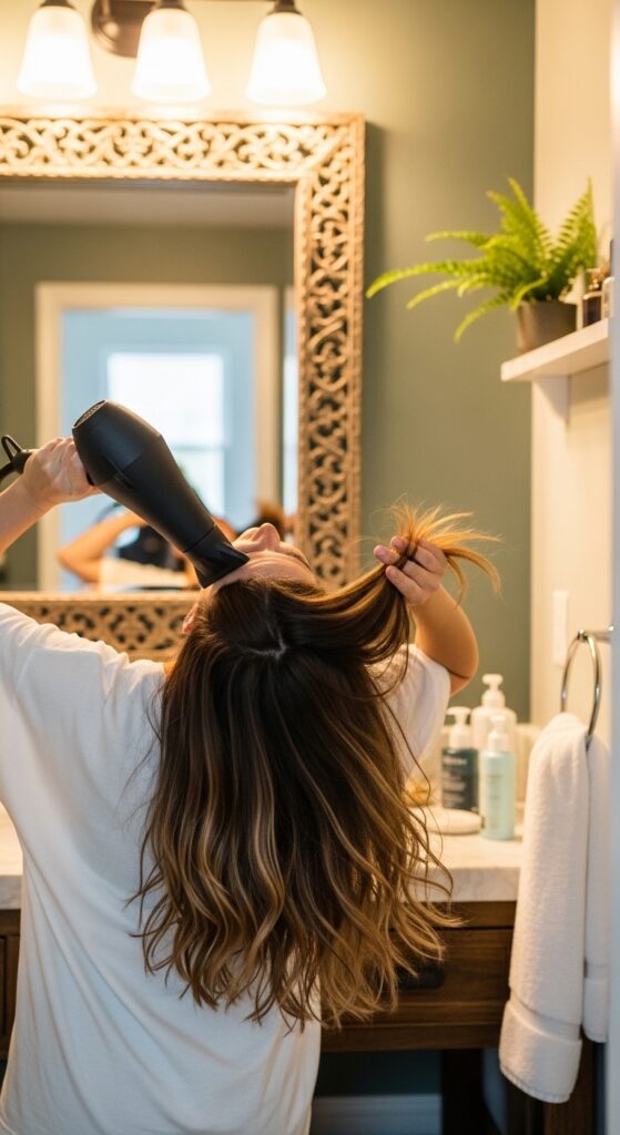Your blow-dry technique is everything. For instant lift at the roots, which pulls everything up visually, flip your head upside down while you dry the roots of your hair about 80% of the way.
