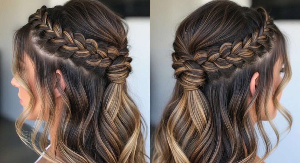 This style looks intricate but is deceptively simple. The pull-through braid creates a beautiful, woven effect that is perfect for weddings, proms, or any romantic occasion.