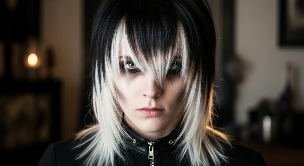 The color follows the chaotic, textured layers of the cut, emphasizing its rebellious spirit. It’s darkly romantic with a punk edge.