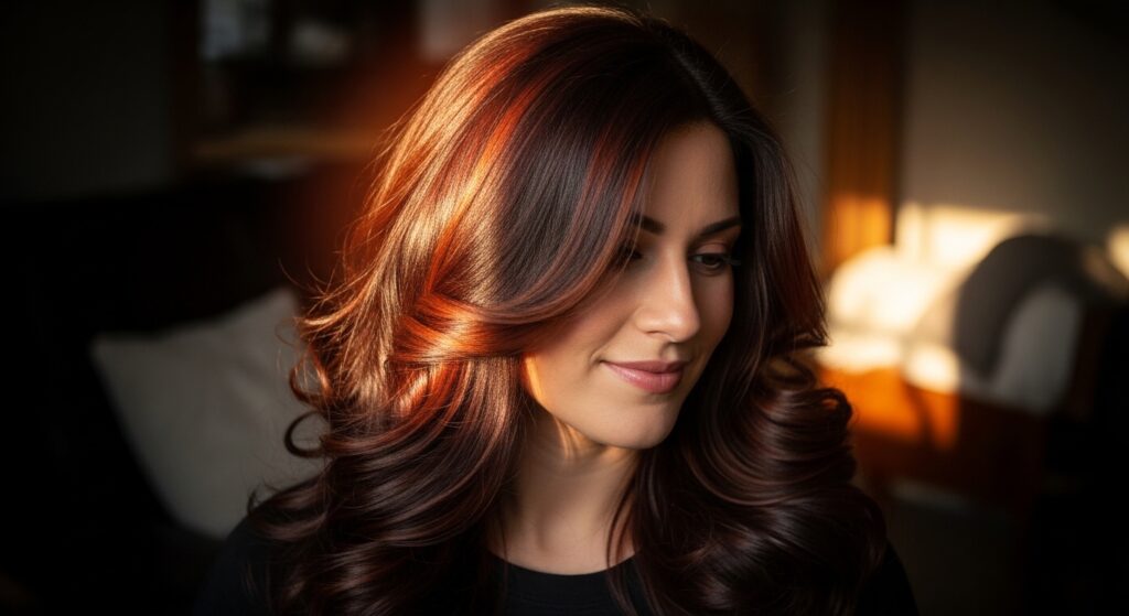 For deep brunettes, red doesn’t have to be loud. This technique uses a rich, spicy auburn or mahogany balayage on a dark espresso base. The warmth is concentrated around the face, making your features come alive.