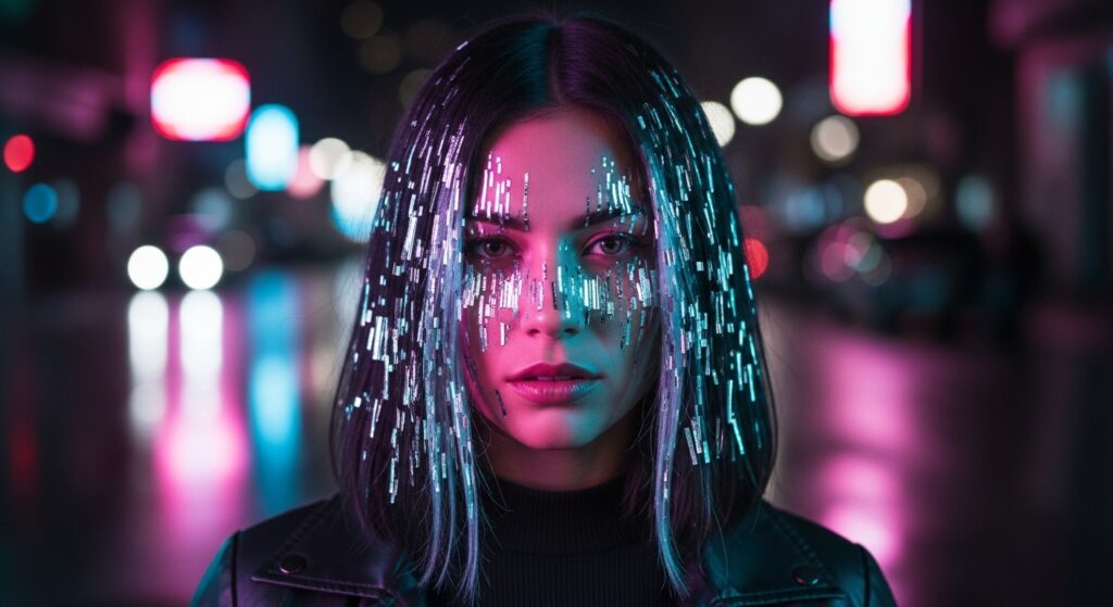 - Ask for: “Broken, glitchy highlight placement around my face with a metallic tone.”