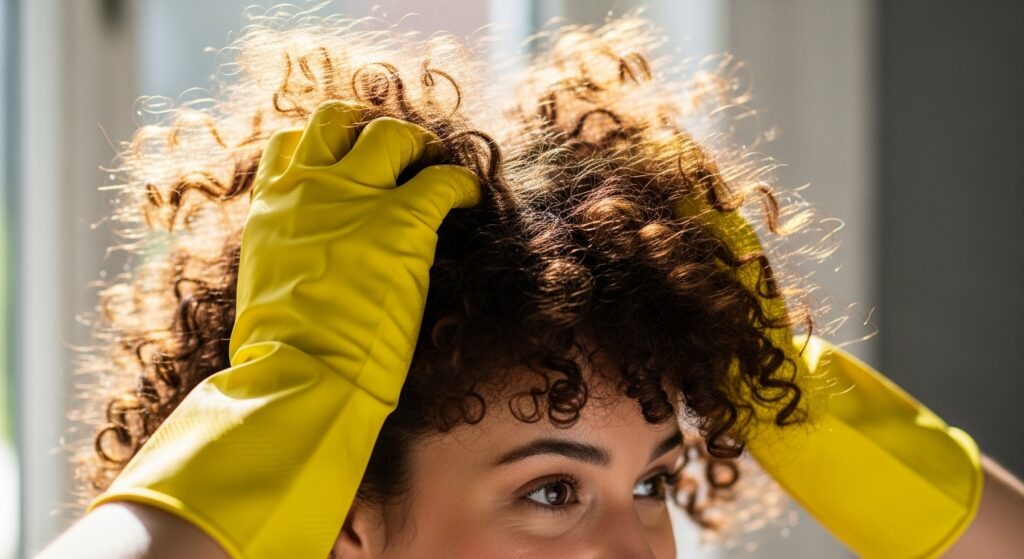 - After applying your curl product to damp hair, put on a pair of clean dish gloves.