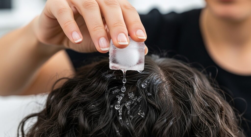 - Take an ice cube and gently run it over the outer layer of your hair, following the curl pattern.