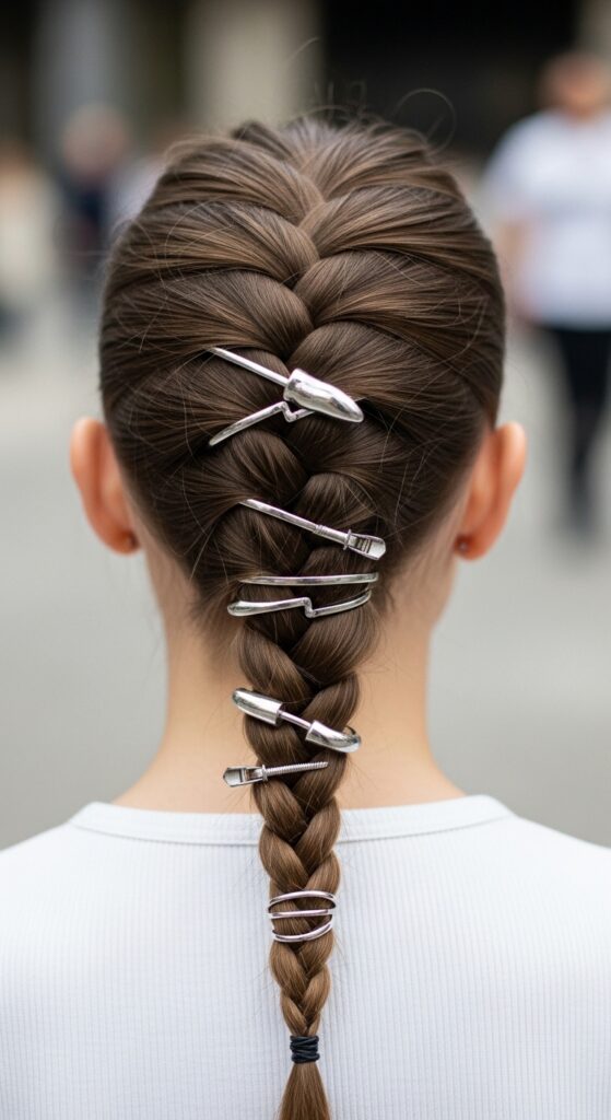 Place one where the braid might look puffiest. The eye is drawn to the shiny accessory, not the volume underneath. It’s a cool, easy hack that makes your braid look deliberately edgy and modern.