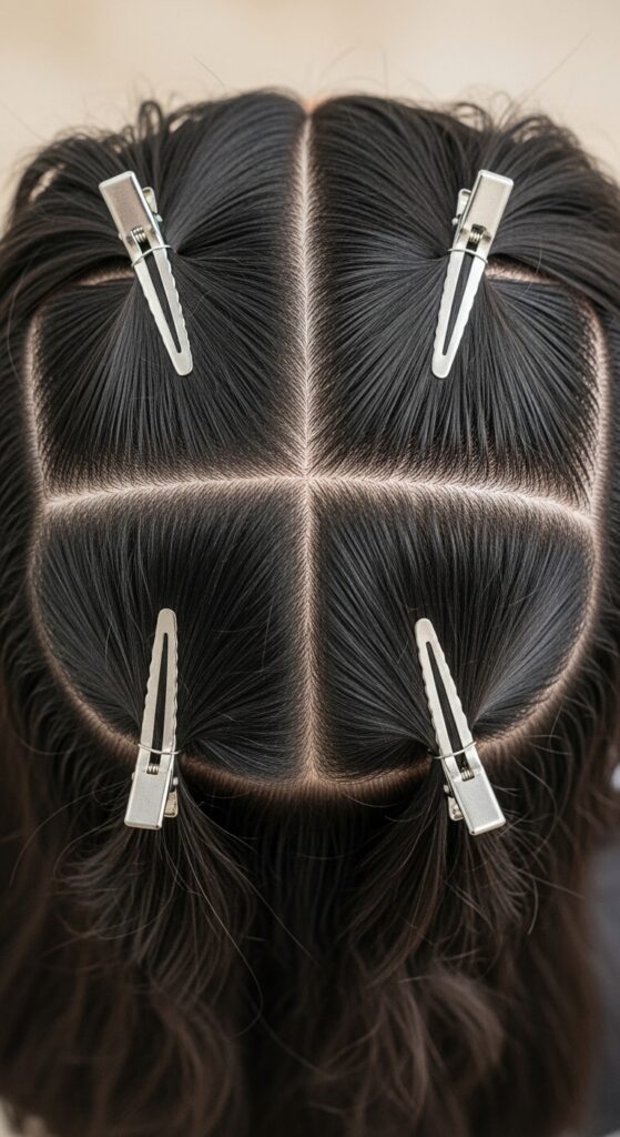 Then, clip away the top half. Start braiding the bottom section first. This keeps the hair from getting tangled and allows you to make each braid tighter and neater. Clean sections are the foundation of a non-bulky style.