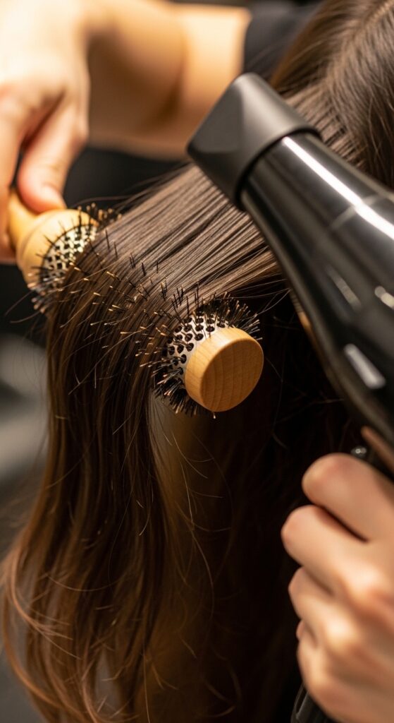 Work in small sections with a round brush. Pull the hair taut as you dry, focusing on the roots first for lift, then smoothing the length. This process stretches the hair shaft slightly, reducing overall bulk and making each section easier to handle.