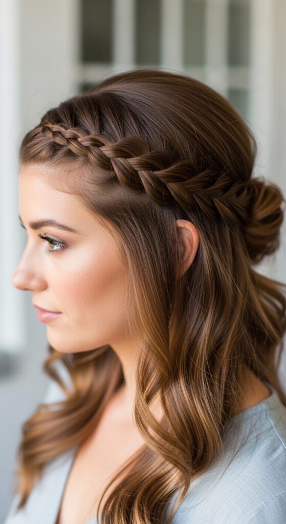If a full braid feels like too much, a half-up style is your answer. It removes weight from the crown and temples, where bulk is most noticeable. Create a small, flat Dutch braid on each side, or a single braid at the crown.