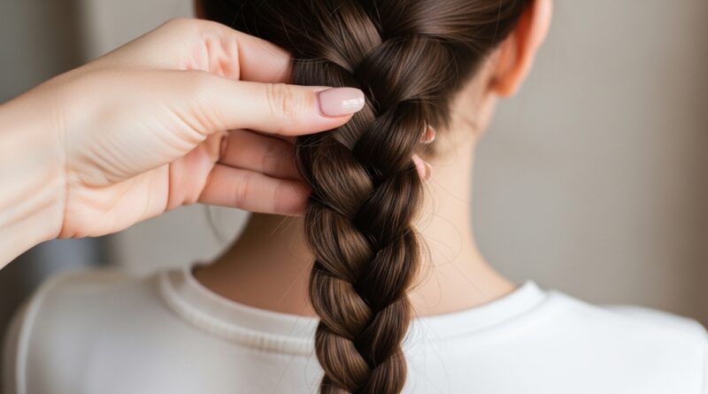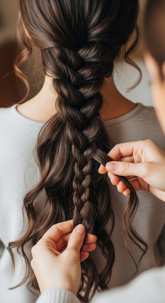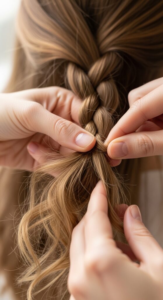 When you run out of hair to add, do three or four more regular crosses of the thin tail. Before you tie it, gently tug on the outer loops of the braid to loosen it slightly and make it look fuller and softer—a must for old money hair aesthetics.