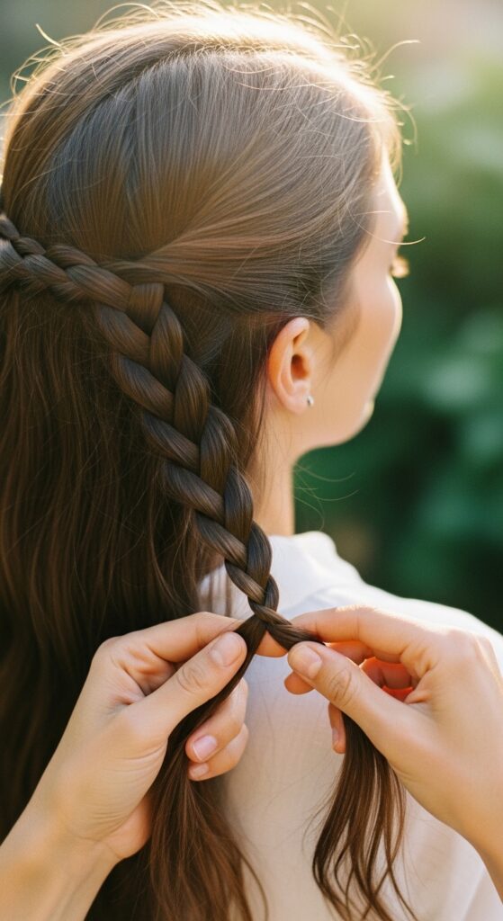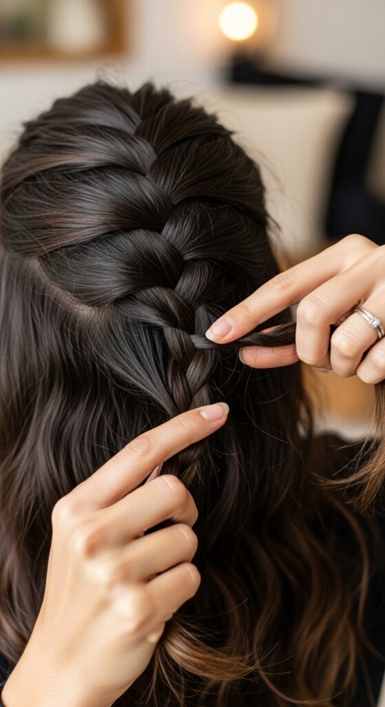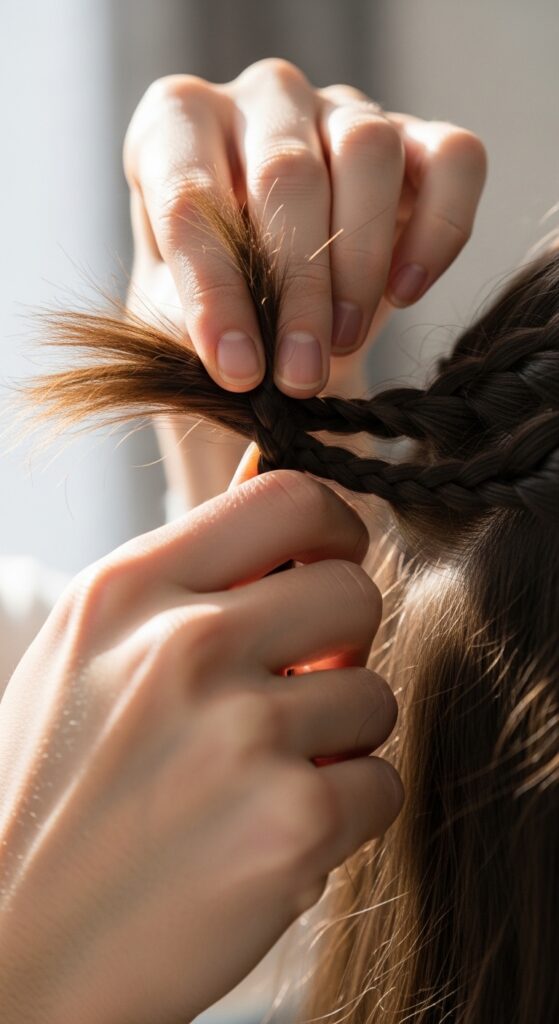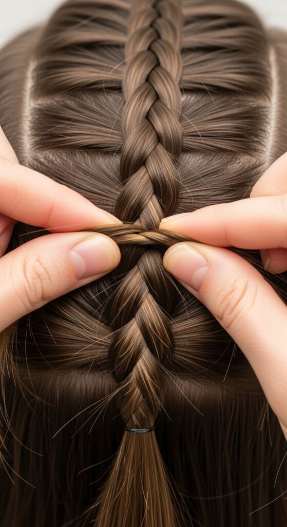The first two crosses set the whole braid’s alignment. Take your time here. After dividing, do your first “right over middle” and “left over middle” slowly. Use your pinkies to anchor the sections you’re not holding.