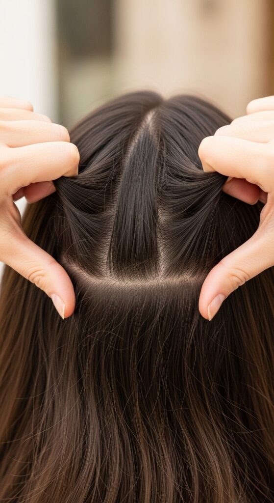 Then, simply divide the hair on either side of your thumbs. Don’t worry about perfect, straight parts. A little organic, uneven sectioning often looks more modern and soft, perfect for that asymmetrical lob vibe.
