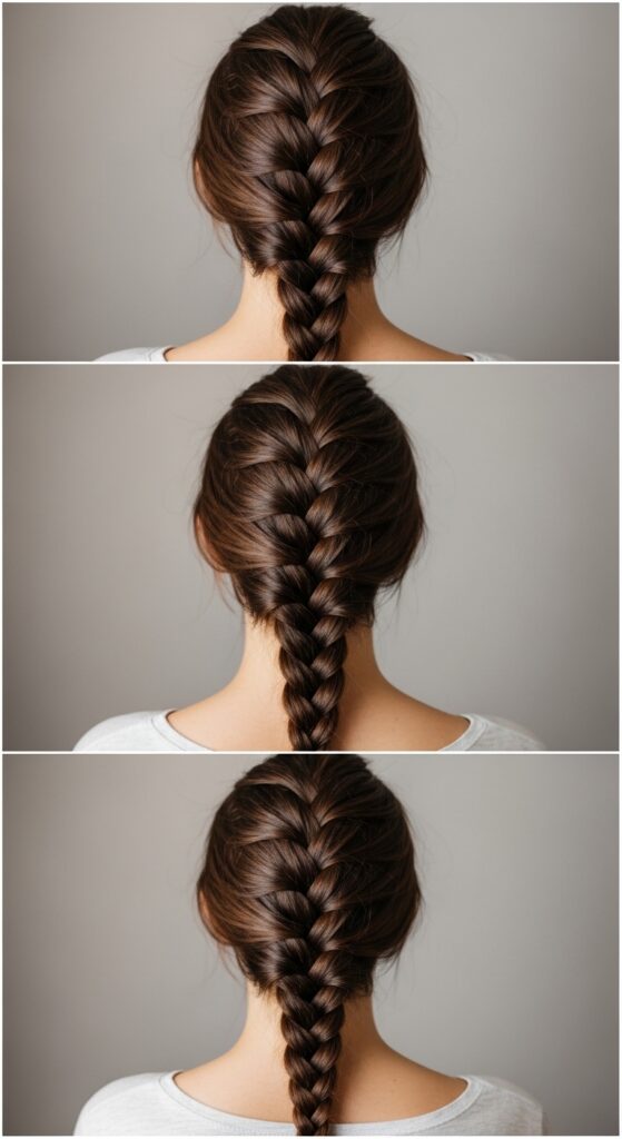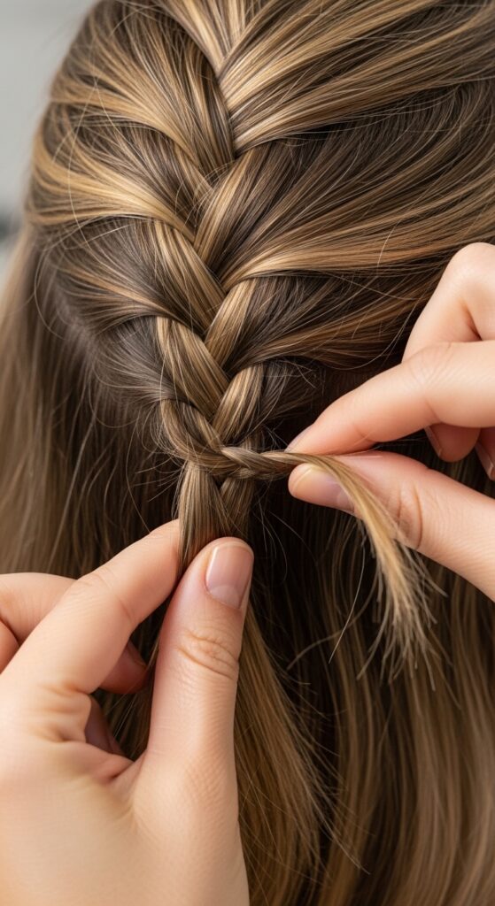 Once a basic braid is easy, try adding hair. For a Dutch braid (which pops out), you’ll cross sections under the middle. As you bring a section under, use your free thumb to sweep a little hair from that side of your head into it before crossing.