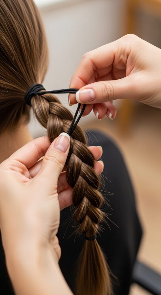 Then, use one strong elastic to secure the end. Wrap it multiple times until it’s snug. For a seamless look, you can take a tiny piece of hair from the tail and wrap it around the elastic, securing it with a bobby pin underneath.