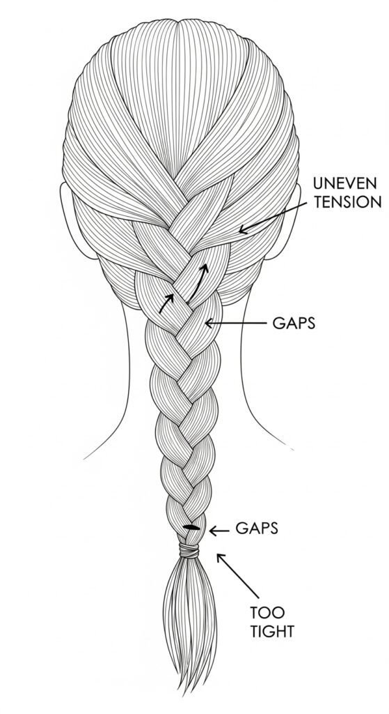 - Pulling too tight: Gives you a headache and a skinny, severe braid. Consciously loosen your grip.