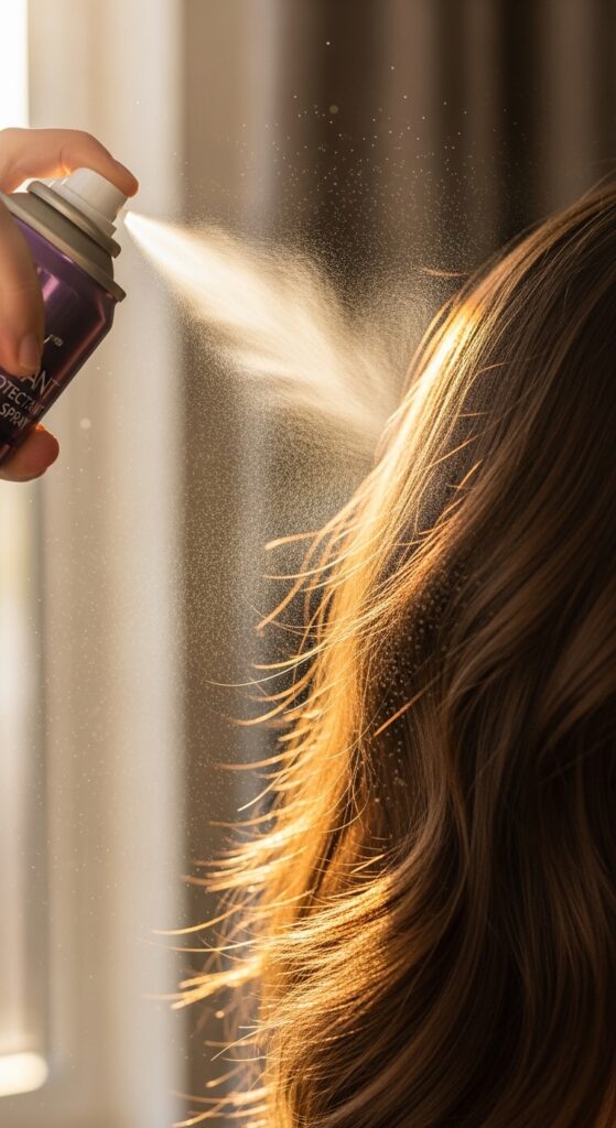 Before any heat styling, I spray a light blowout or heat protectant spray through my dry hair. This adds a light layer of hold and silkiness without any stickiness or crunch.