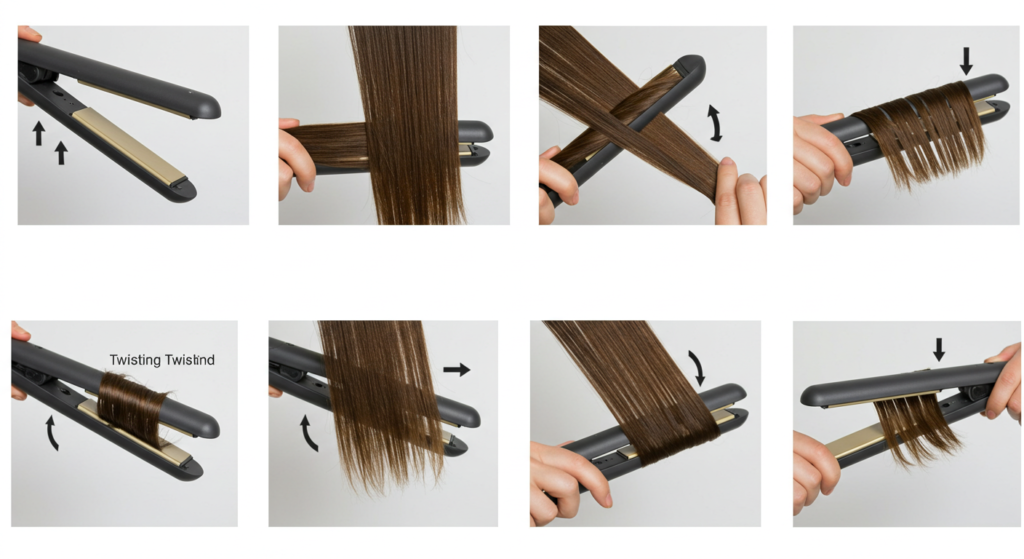 Place the straightener about an inch from your roots. As you glide down, slowly twist the straightener away from your face. The motion should feel like you’re wrapping the hair around the plates.