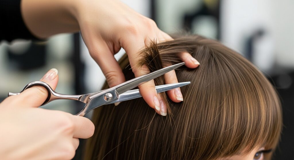 A point-cutting technique is often used to create a soft, textured edge rather than a harsh, solid line. This technique is a huge part of achieving that undone, lived-in texture. The stylist will also cut the bangs dry a lot of the time. This allows them to see the natural fall of your hair and how the weight is distributed, ensuring the final shape is perfect for your hair’s unique behavior.