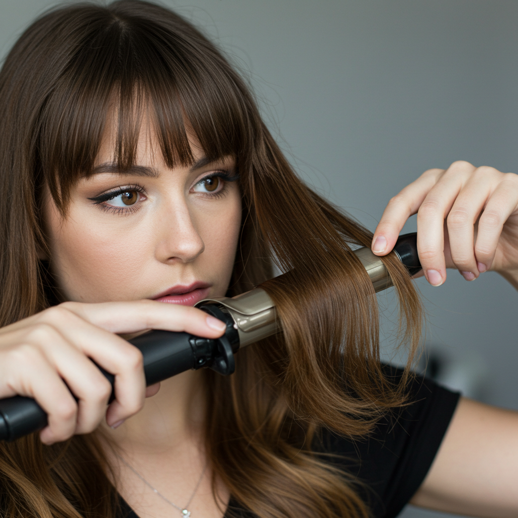 Step 3: Use a flat iron or curling wand to add soft bends to these sections, directing them outward for that signature curtain effect.