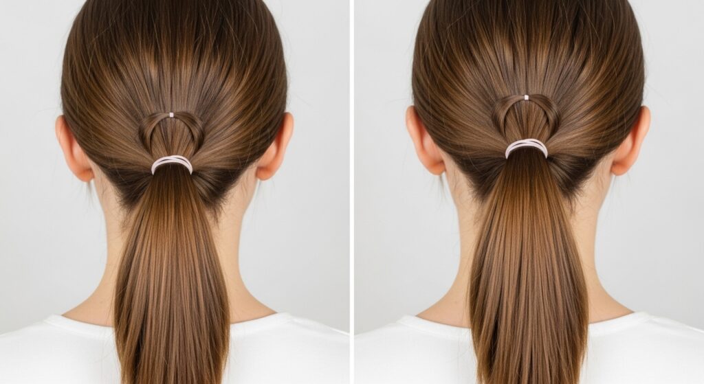 Step 2: Divide and Conquer. Split the looped section down the middle, creating a hole. Gently pull the ponytail’s tail (the part you didn’t pull through) upwards and tuck it down through this hole. You’re essentially creating a simple knot.