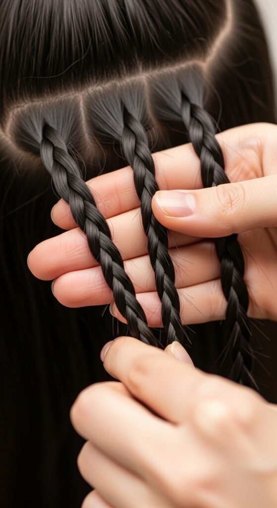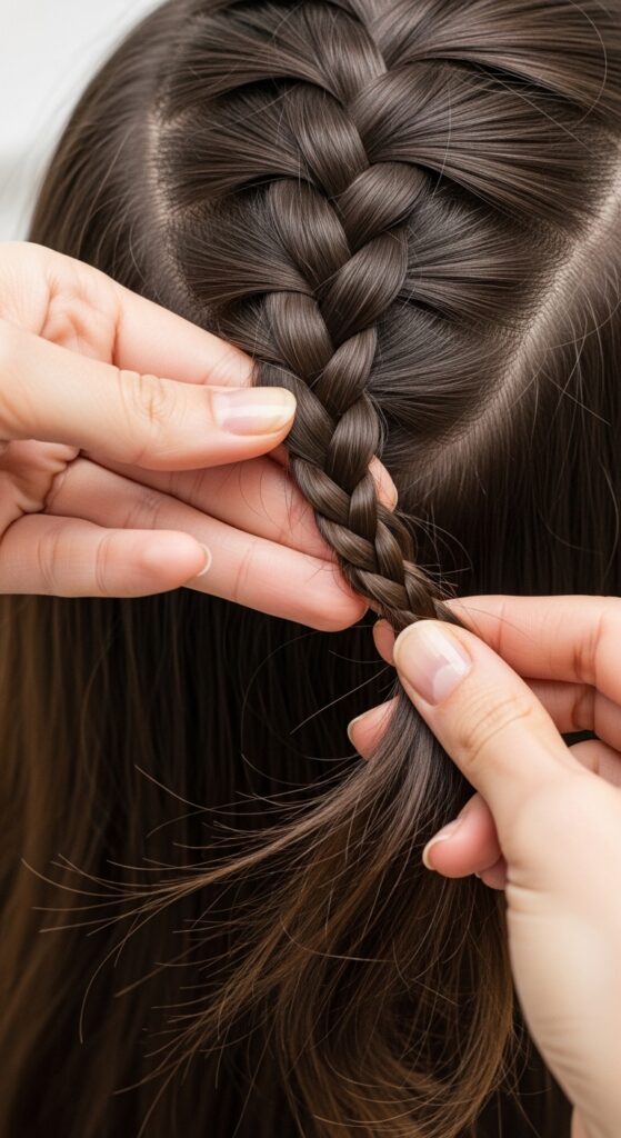 Aim for consistent, firm tension from root to tip. Pull each section evenly as you cross them over. The braid should feel secure but not painful on your scalp.