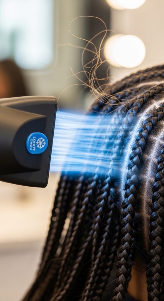 Run the cool air over your braids for a minute or two. This helps “set” the products and the style, locking the cuticle down to repel moisture.