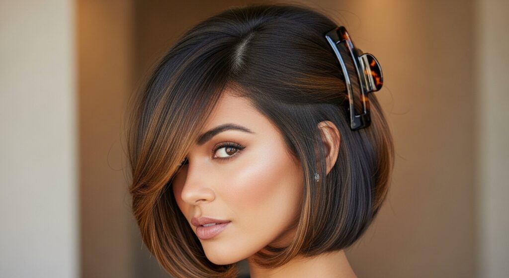 The Classic Claw Clip: Pull the front sections of your hair back loosely and secure them at the crown with a large, neutral-toned claw clip. This instantly creates a chic, face-framing effect that highlights the angle of your cut while looking effortlessly cool.
