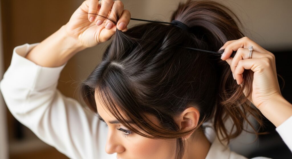 Next, focus on the crown of your head. Using the tip of a comb or your fingers, gently pull out small, random sections of hair from the top and sides of the ponytail base. Pull them out just a centimeter or two—you’re not trying to undo the ponytail, just to create a relaxed, lived-in volume. The key is to do this gently and sparingly. Pull from different areas to avoid creating a uniform, helmet-like line. This controlled pulling transforms a tight, harsh ponytail into something soft, romantic, and expertly undone.