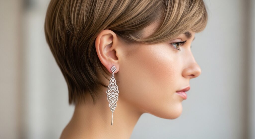 Statement Earrings are Your Best Friend: With less hair around your face, your features are highlighted. A beautiful pair of statement earrings—whether they are dramatic hoops, elegant studs, or modern geometric shapes—immediately draws the eye and elevates your entire look. It says, “This haircut was intentional, and so is my style.”