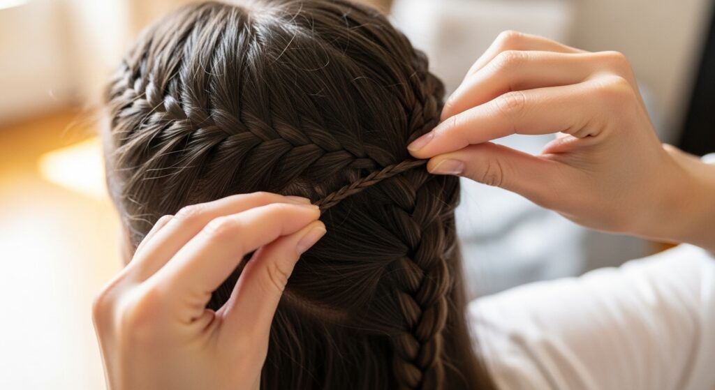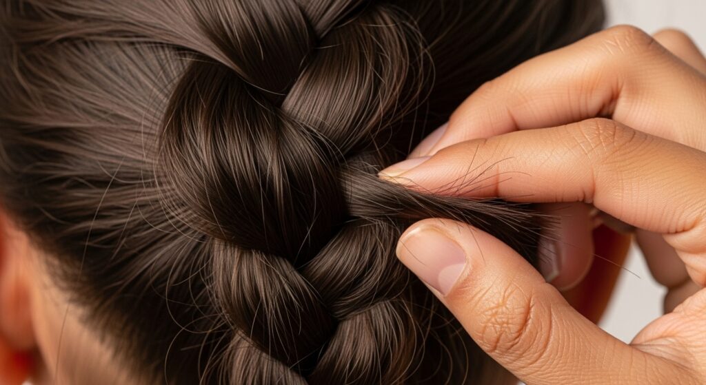 Now, for the “angled” part. Before you cross the next strand under, you will add more hair to it. As you work your way down the diagonal guide you mapped out, always add hair only from the top section (the side closer to your crown).