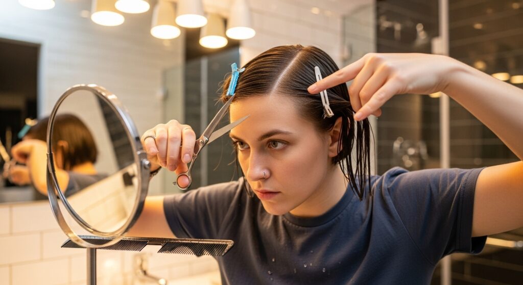 The key to an even bob is using your existing haircut as a guide. Section your hair cleanly, parting it down the middle and then creating a horizontal part from ear to ear, clipping the top section away. Start with the bottom back section. Comb it straight down and, using your fingers as a guide, make small, careful cuts vertically into the ends (this is called point cutting) to create a soft, blended line rather than a harsh, blunt one. Work your way up to the side sections, always checking for balance by bringing hair from both sides to the front to ensure they are the same length.