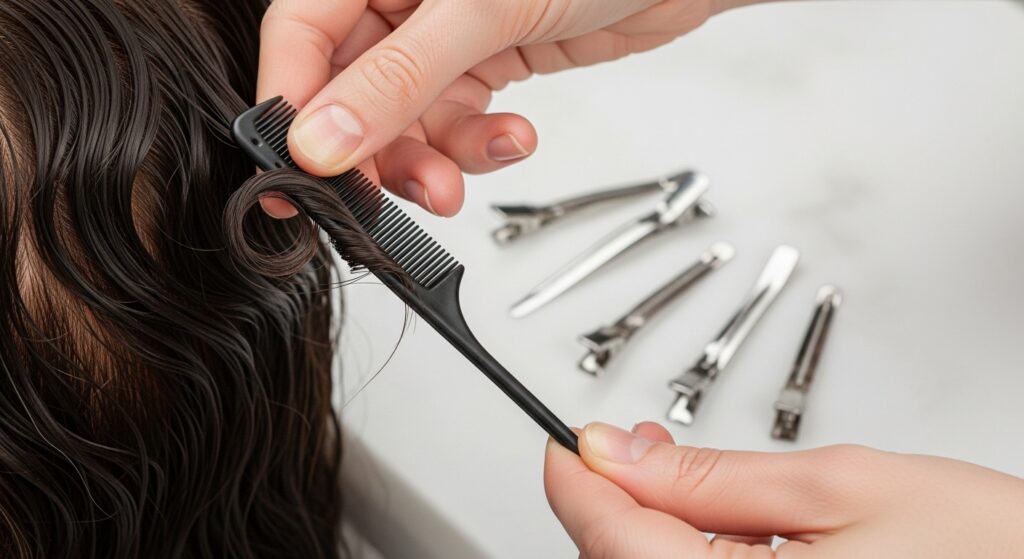 Teasing for Volume: Lightly backcombing (teasing) the hair at the crown and roots is essential for that classic retro volume. Take small sections, hold them straight up, and gently brush the hair downwards towards the scalp a few times. Smooth the top layer over the teased section for that polished, “beehive” foundation.