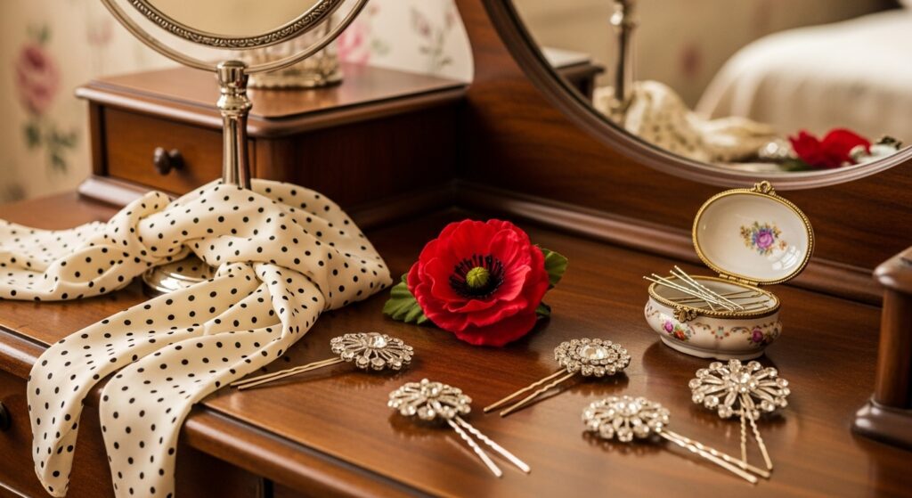 Accessorize Authentically: No retro look is complete without the right accessories. A silk scarf tied like a headband, a classic flower clip, or decorative hairpins can elevate your style and hide any minor imperfections in your styling.