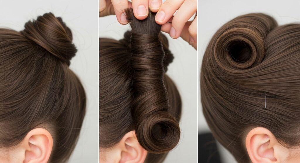 Step 4: This is the crucial part. Secure the roll in place by pushing several bobby pins vertically through the base of the roll and into the hair beneath. Use more pins than you think you need! Criss-cross them for maximum hold.