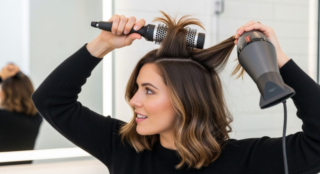 Now, flip back up and use your blow dryer with the concentrator nozzle. Using a round brush, start at the roots of a section and pull the hair up and away from your head, directing the heat from the roots to the ends. This technique, called over-directing, is the secret to that iconic crown volume. Work section by section until your hair is smooth, dry, and full of body. The goal is a smooth, bouncy base, not a perfectly sleek blowout.