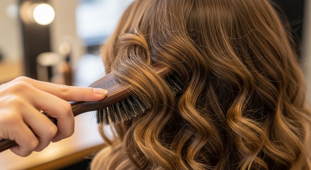Take your boar bristle brush and gently, gently brush through the curls. Start from the ends and work your way up to break up the curls into soft, unified waves. You’re not trying to brush them straight; you’re blending them together. Use your hands to shape the waves, pushing them into place. See how the volume at the crown is already incredible? That’s the result of your careful blow-dry and setting.