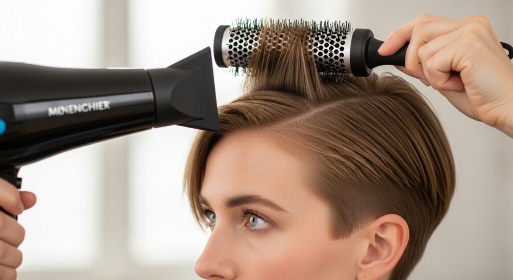 Start by applying a light mousse or volumizing spray to your roots. Tilt your head forward and dry the hair at the nape of your neck first, directing the airflow down the hair shaft to smooth the cuticle. Then, focus on the crown—this is the area that gives your pixie its lift and shape. Use your round brush to lift sections at the root, drying them thoroughly while directing the heat from the roots to the ends.