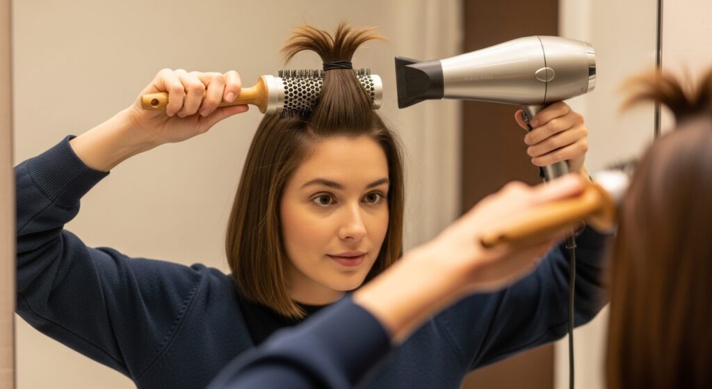 Once the bottom is dry, unclip the top section and divide it into smaller, manageable parts. Continue the same technique, focusing on lifting the roots with the brush. For an extra boost, when a section is about 90% dry, roll it onto the brush, hold it up, and hit it with a blast of cool air from your dryer. This “sets” the volume in place. A pro tip is to flip your head upside down for the last few minutes of drying to add even more overall body and root lift.
