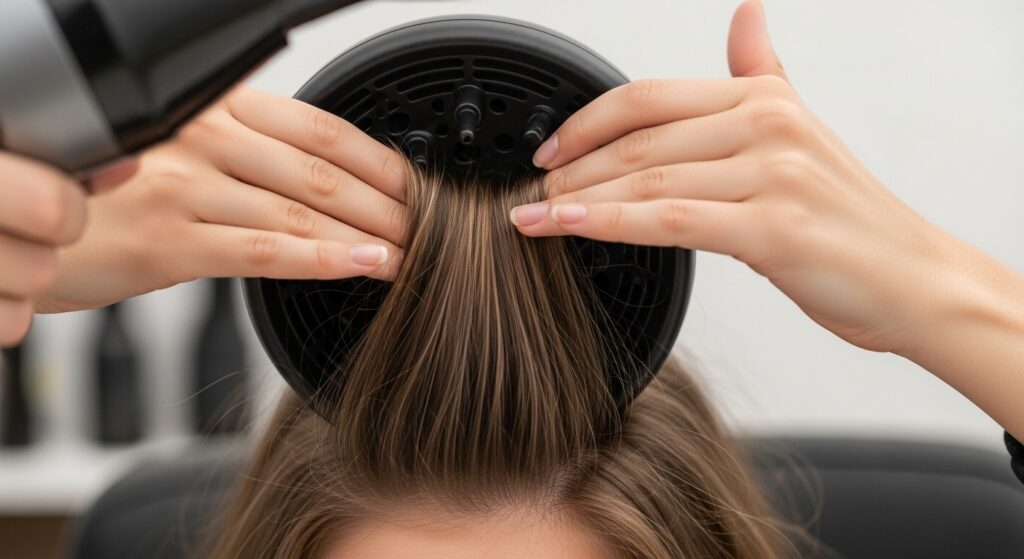 First, do not disturb your waves! This is the golden rule. After applying your products, flip your head upside down. Place sections of your hair into the diffuser bowl, then gently bring it up to your scalp. Turn the dryer on to a medium heat and speed setting. Hold it in place for a few minutes, then move to a new section. You are “hovering” or “pixie” diffusing, not constantly moving the dryer around.