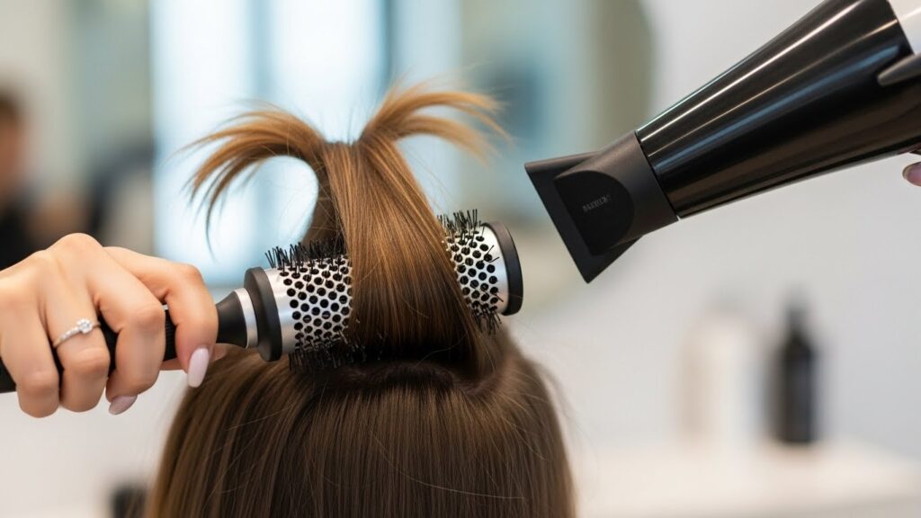 Begin by rough-drying your hair until it’s about 80% dry, flipping your head upside down to encourage lift at the crown. Then, section your hair. Start with the lower sections at the nape of your neck, working your way up. For each section, place the round brush under the hair at the root, lift it slightly away from the scalp, and direct the dryer’s nozzle down the hair shaft (following the cuticle) as you slowly pull the brush through.