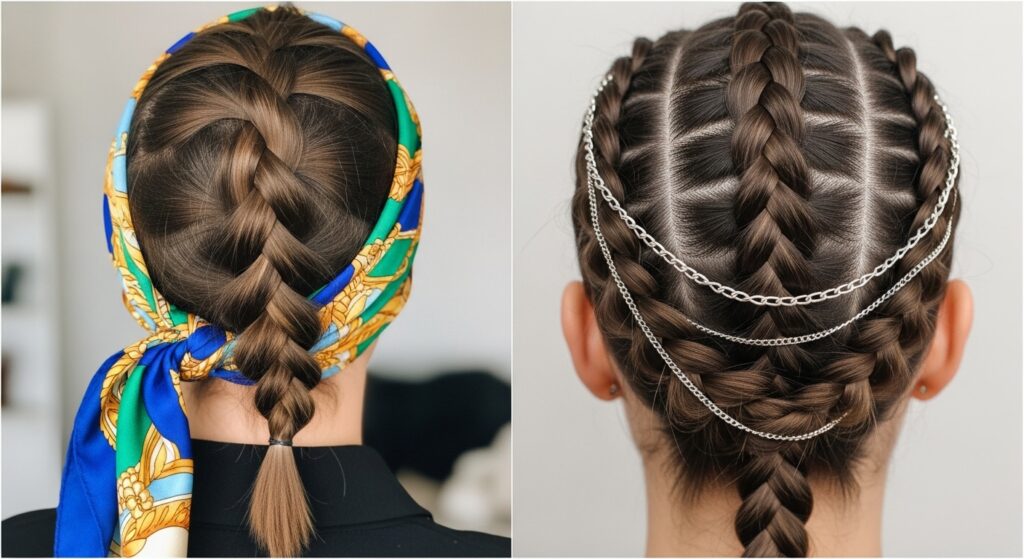Take a beautiful silk scarf and wrap it around the base of your braid as a headband, letting the tails flow freely. This instantly covers any messiness at your crown and parts. Alternatively, weave a delicate gold or silver chain through your braid. The sparkle and detail will draw the eye away from any imperfections and towards the beautiful accessory.