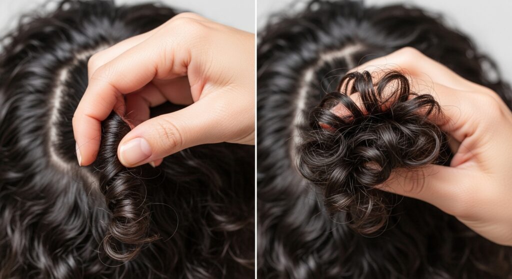 This “roping” motion helps to evenly coat each curl strand and encourages them to clump together beautifully. Follow this immediately with a gentle scrunch to set the shape. This two-step process takes seconds per section but creates noticeably more defined, uniform curls without the need for additional product.