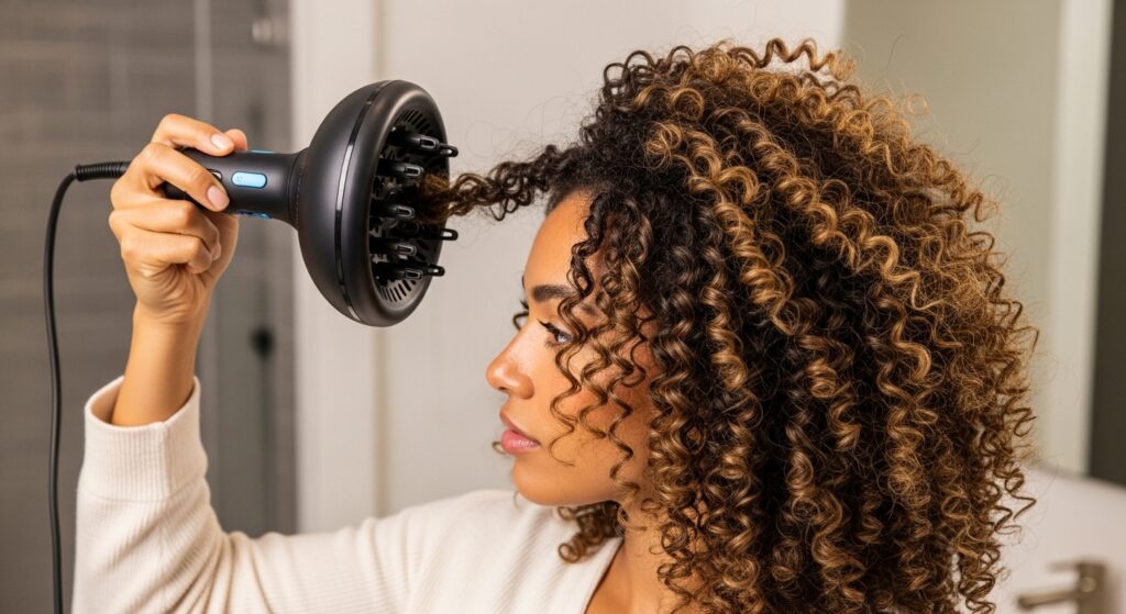 Turn your diffuser on to a medium heat and medium speed setting. Instead of touching your hair with the diffuser, simply “hover” it around your head, focusing on the roots and the areas that take the longest to dry. This sets the cast and dries the roots without disturbing the curl formation. Once your cast is 80% set, you can then gently cup sections of your hair with the diffuser to finish drying. This technique preserves definition and minimizes frizz for a sleeker, more polished look.