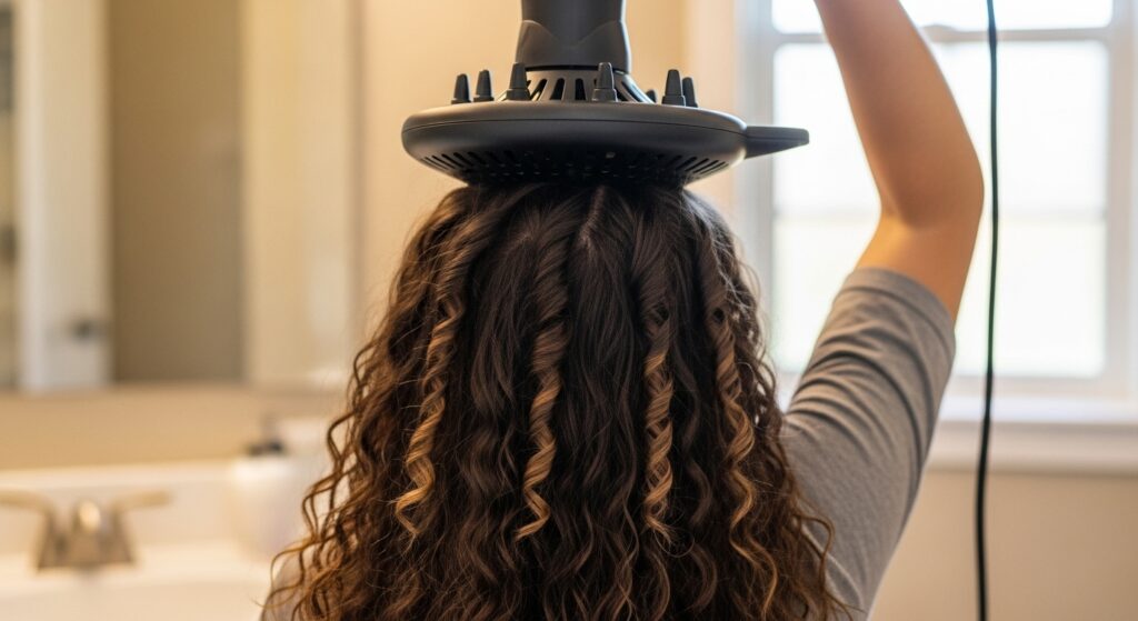 The key is a gentle, hands-off technique. After applying your products, attach the diffuser to your hairdryer. With your head flipped upside down, place sections of your hair into the diffuser bowl, then gently lift it to your scalp. Do not scrunch with the diffuser—this causes frizz. Instead, just let your curls sit in the bowl. Use a low heat and low speed setting to prevent disruption. Hold it in place for a few minutes per section until a light cast forms. This “hover” or “pixie” diffusing method sets the root for volume and dries the cast without disturbing your beautiful curl clumps. You don’t even need to dry it completely; just get it 80-90% dry and let the rest air dry for the softest results.
