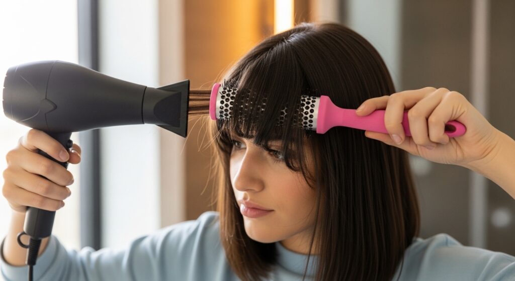 For a more dramatic upgrade, try a slight bend. Using a flat iron, clamp your bangs at the root, pull them slightly forward, and then curve the iron away from your face about halfway down. This creates a retro, “bottled” effect that looks incredibly chic and intentional. A little texturizing powder at the roots will keep them lifted and separated from the rest of your hair all day.