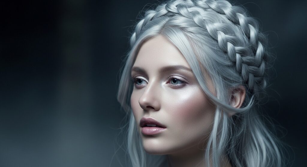 This style is pure poetry. It gives off major romantic goth hairstyles energy—ethereal yet dramatic. The braids protect your ends, while the icy color peeking through creates a stunning, crown-like effect.