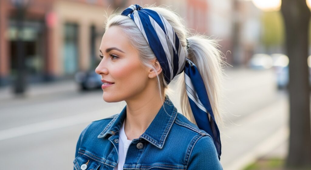 You can also use it as a headband or wrap your entire hairline. It keeps baby hairs flat and protects your color from sun fading. Look for prints that complement your platinum tones, like deep blues or charcoal grays.