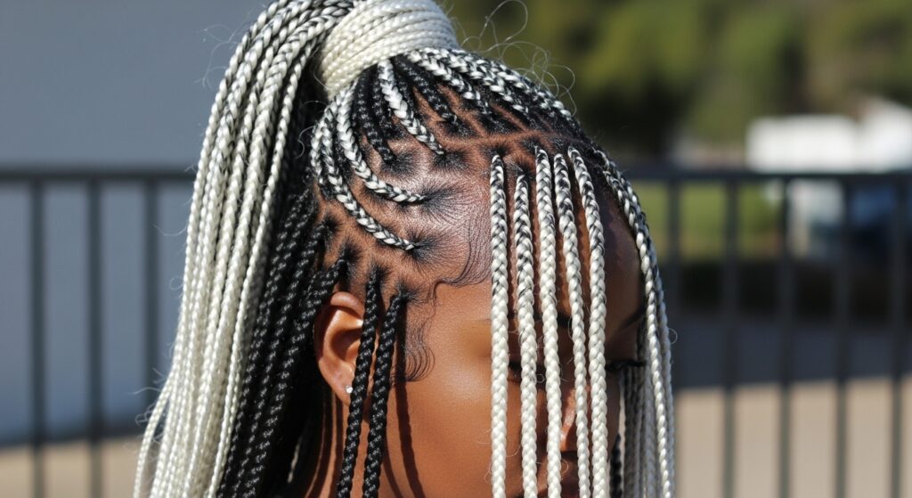 Want to go all-in? Consider installing medium box braids and having just the tips colored a matching icy platinum. It’s a bold, fashion-forward look that gives you the color without the all-over commitment.