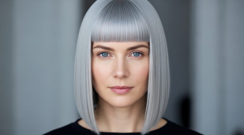 The hime cut, with its straight-across fringe and long face-framing pieces, gets a modern update in icy silver. It’s dramatic, geometric, and incredibly striking. The blunt cuts keep ends looking thick and healthy.