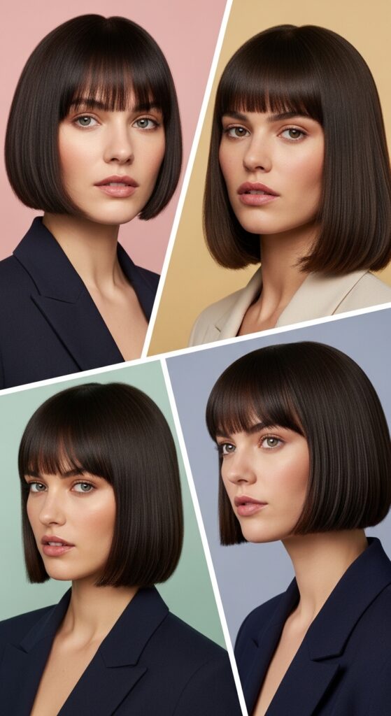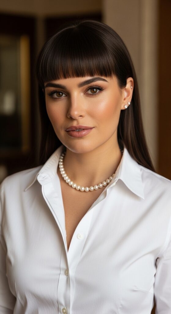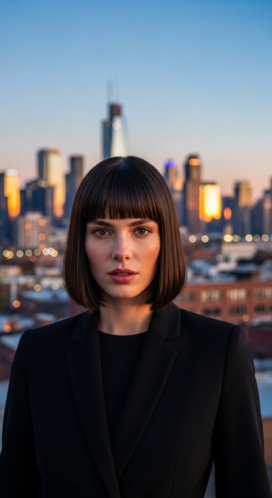 The key is the bluntness. There are no wispy pieces or layers here. It’s a solid, clean line that frames your face with graphic precision. It pairs best with sleek, straight hair, creating a cohesive, modern silhouette.